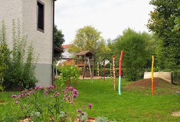 Der Spielplatz ist naturnah und abwechslungsreich gestaltet. Eine Schaukel, ein Kletterturm mit Rutschbahn und eine Röhre laden zum Spielen und Verweilen ein. Auch gibt es genügend schattige Plätzchen und Möglichkeiten, um Verstecken zu spielen. Es hat eine Wildblumenwiese, wo Krabbeltiere entdeckt und beobachtet werden können. Ein grosser Sandkasten, umrandet von Akazien-Baumstämmen, lädt zum Graben und Bauen ein. Ebenfalls gibt es einen Wasseranschluss, um im Sand Fluss- und Seelandschaften zu gestalten oder einfach das Kräuterhochbeet zu bewässern. Zudem stehen von Frühling bis Herbst für alle Kinder/Besucher Sandspielsachen zur freien Benutzung bereit. Ein grosser Eichentisch bietet genügend Arbeitsfläche mit Sitzgelegenheit, um zu Basteln und zu Zeichnen oder einfach sein Zvieri zu geniessen.